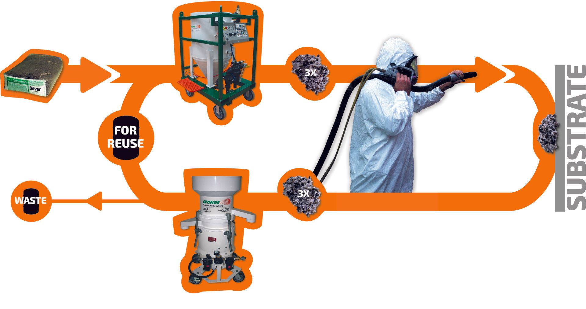This also results in significantly less waste. The used Sponge Media™ can be reused. Recyclers use rapid vibrations to shake and tumble reusable Sponge Media in a spiral path over a series of screens; each size-selected to achieve the desired result. The first coarse screen separates and ejects unwanted, over-sized contaminants (into a waste bucket) that may have been recovered with the blasted Sponge Media. The second screen separates (into another waste bucket):
